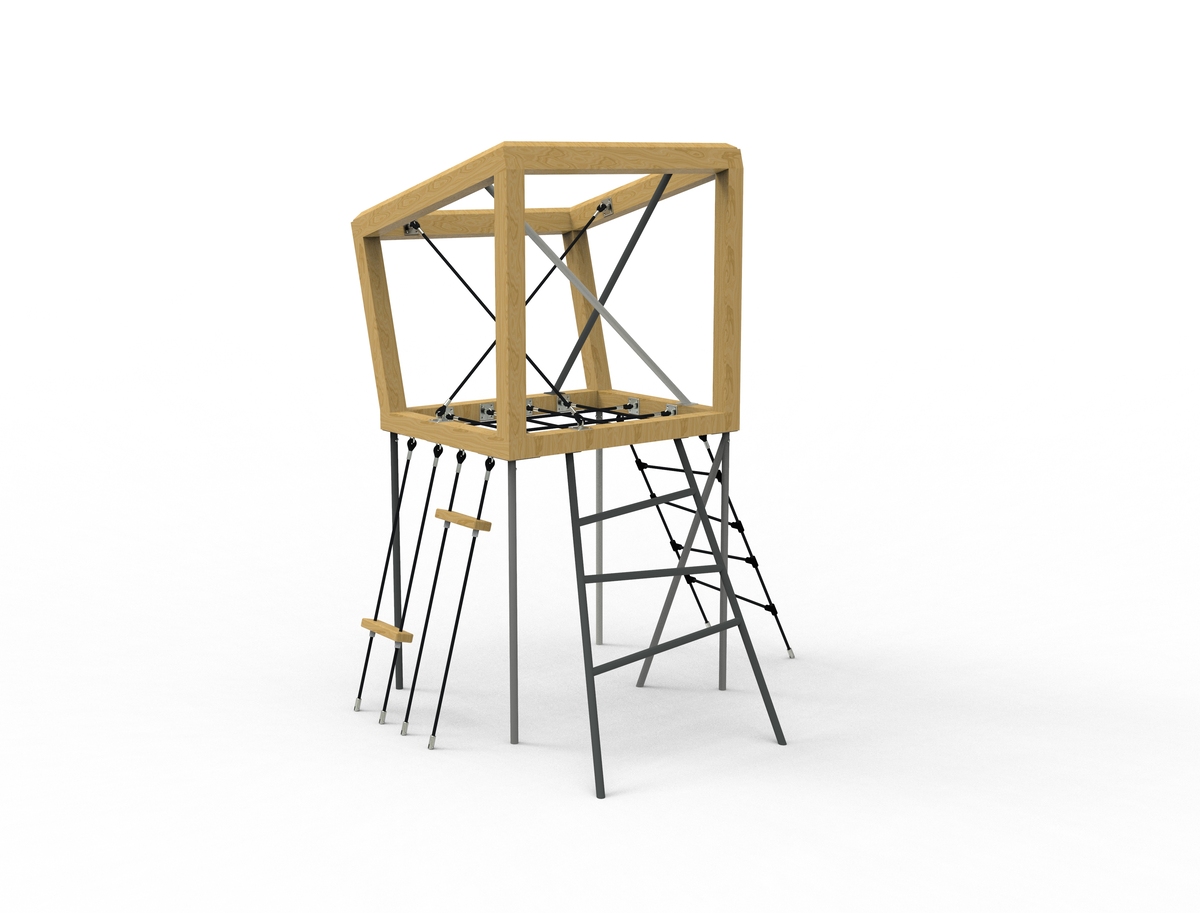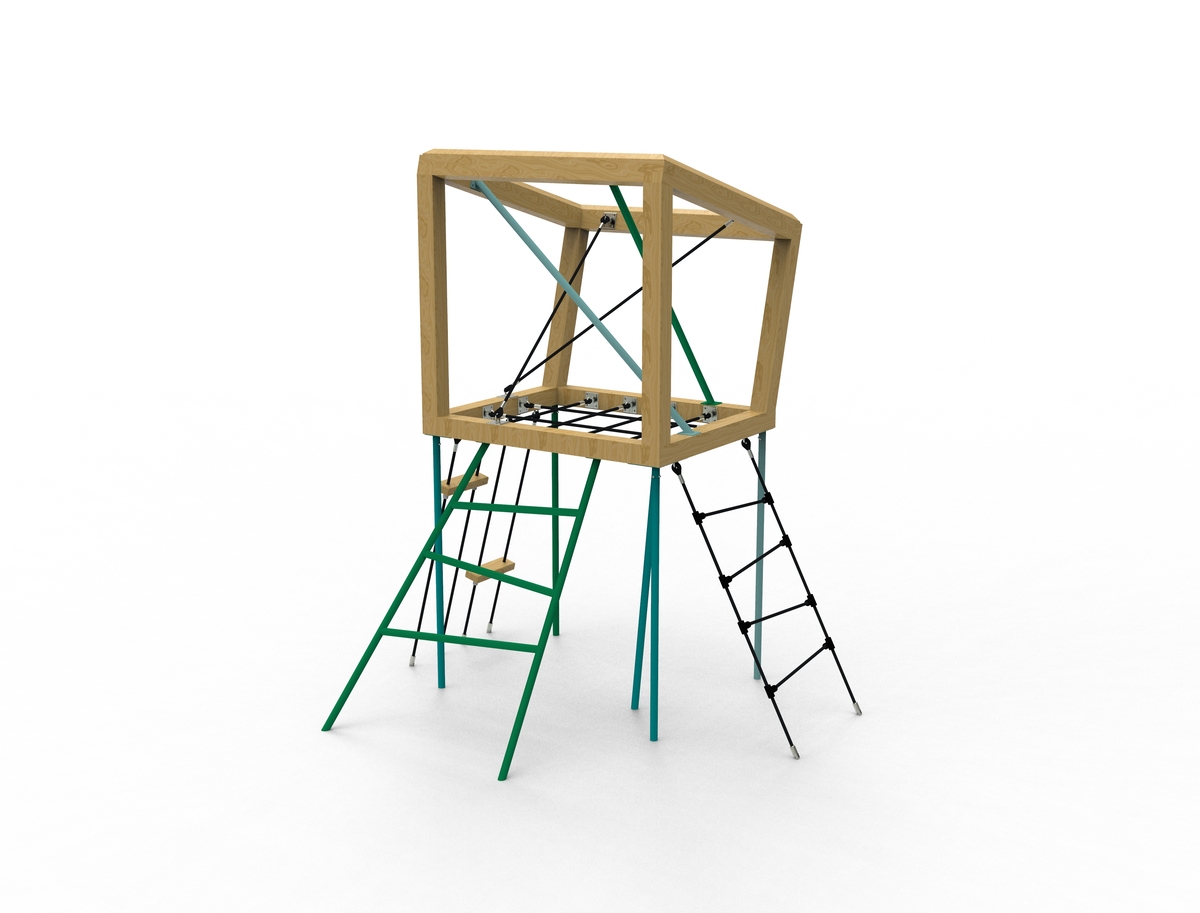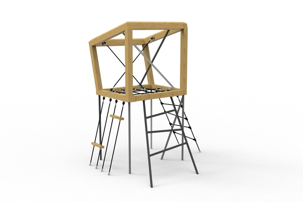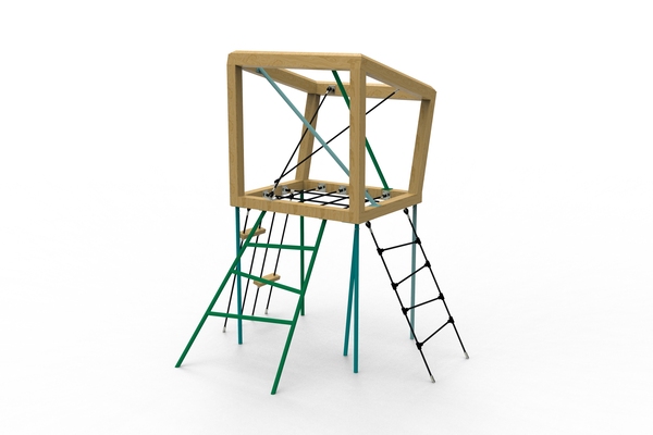 climbing element construction, 1x climbable horizontal net, 2x tilted climbing pole, 2x tilted climbing rope, 1x metal ladder, rope ladder, 1x rope climb with steps