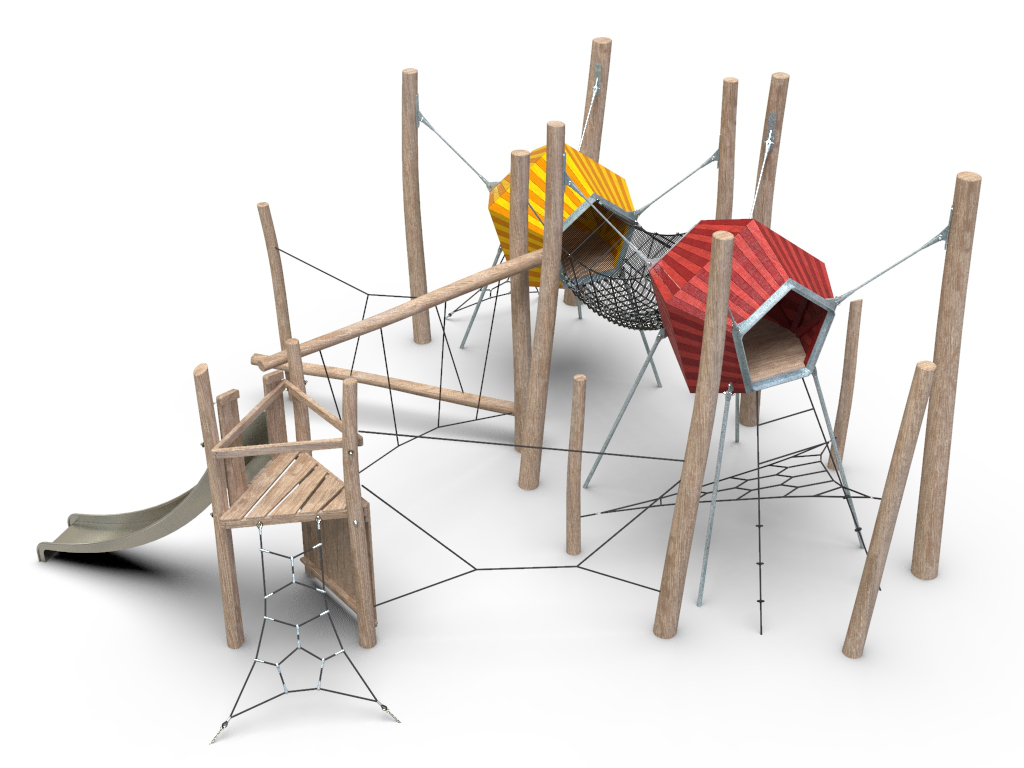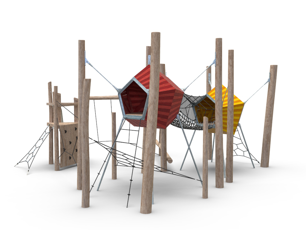2x cocoon wooden construction, 14x acacian stand, 3x tilted climbable net, 1x tilted rope ladder, 1x horizontal rope tunnel, 1x climbing wall, 1x stainless steel, 1x walkable vertical climbing element, 1x balance horizontal log