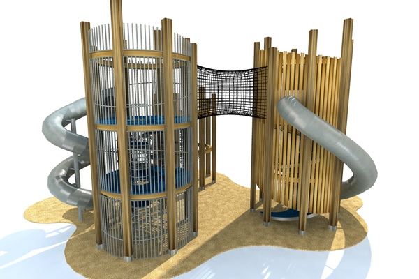 hourglass rope network and funnel, Wire tube, Circular ladder with safety between landings, Level floors, High screw slide, Bunk whisper, Rope closed bridge, Spindle ramp with cast rubber and climbing holds, Arch slide.