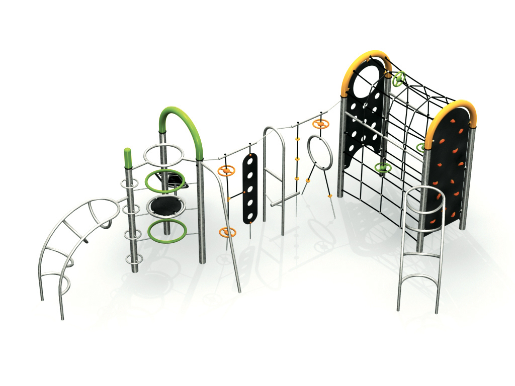 climbing wall with holes, climbing wall with holds, rope net, fire slide pole, monkey track, felly tower, spindle ladder, hole-in ramp, twice curved ladder, handles "Saturn"