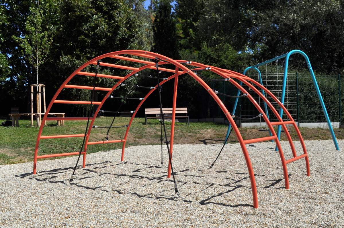 1x oblouková kovová prolézačka s trubkovými a lanovými příčkami, 1x zavěšené do země ukotvené lano, 2x zavěšené do země ukotvené lano s chyty, 1x vertikální do země ukotvená tyč