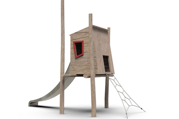 vyvýšený dřevěný domeček, 1x lanový výlez, 1x dřevěný výlez, 3x dřevěná stojka