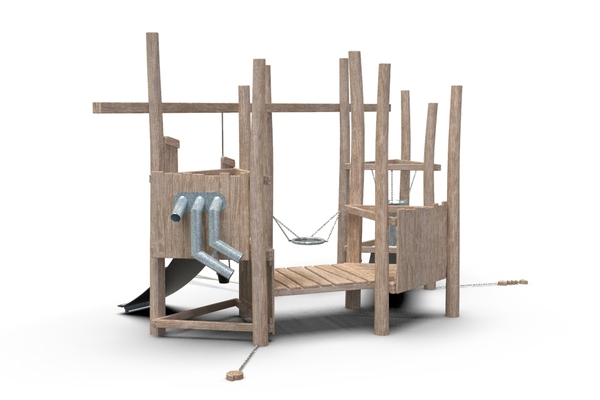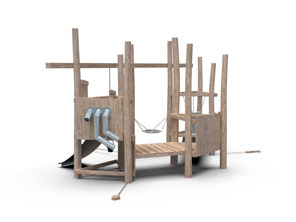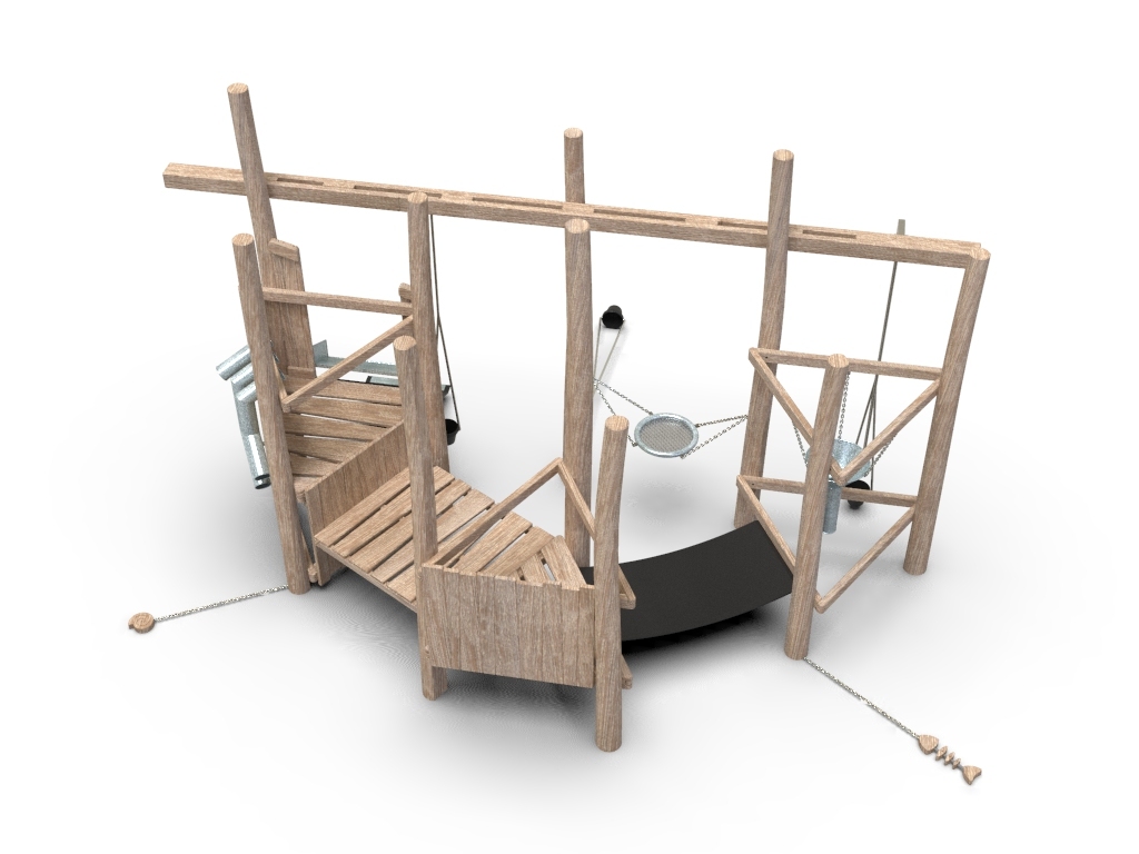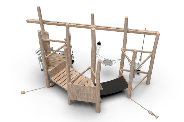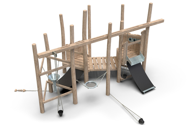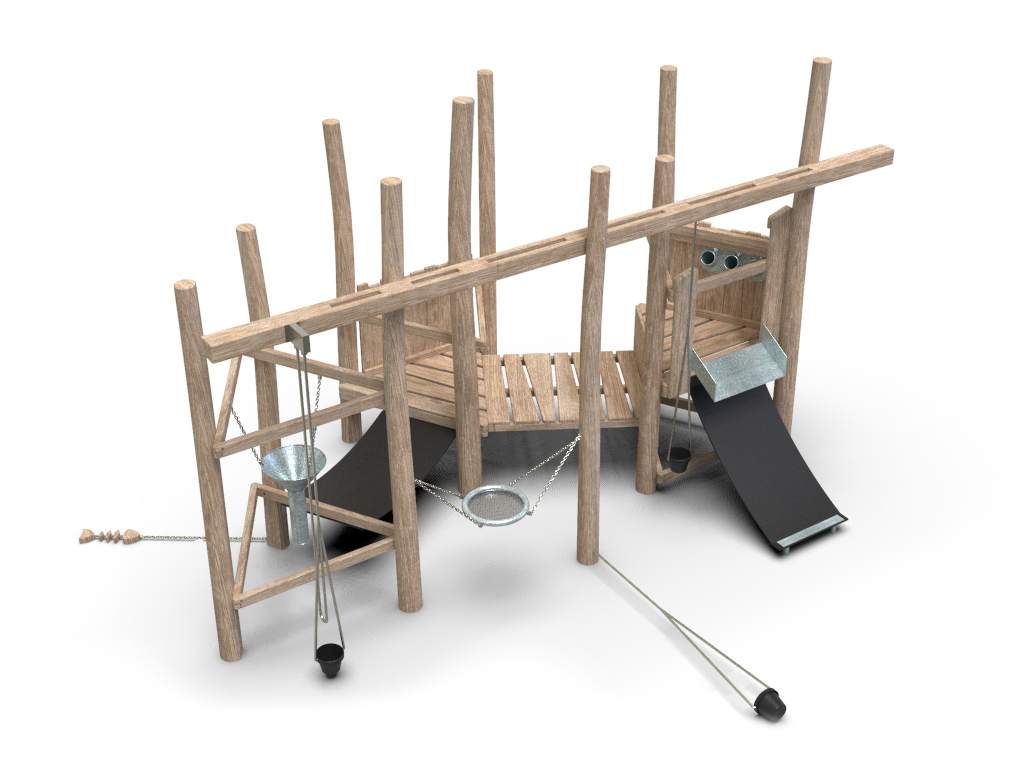 10x akátová stojina, 2x gumový pás, 3x kyblík, 1x kovové síto, 1x kovový trychtýř, 1x kovové prosýpací trubky, 1x kovové koryto, 1x dřevěná ryba