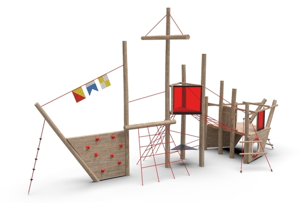 konstrukce prolézačky, nerezová skluzavka, 5x lanový výlez, lezecká stěna s chyty